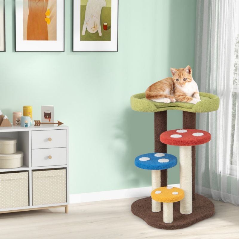 5.Mushroom Design and Wide Use: Give your beloved cat companion a place to call their own with the multi-layer cat tree. With its cartoon mushroom decorations, the cat tower brings a cute touch to your living room, entryway, bedroom, etc.