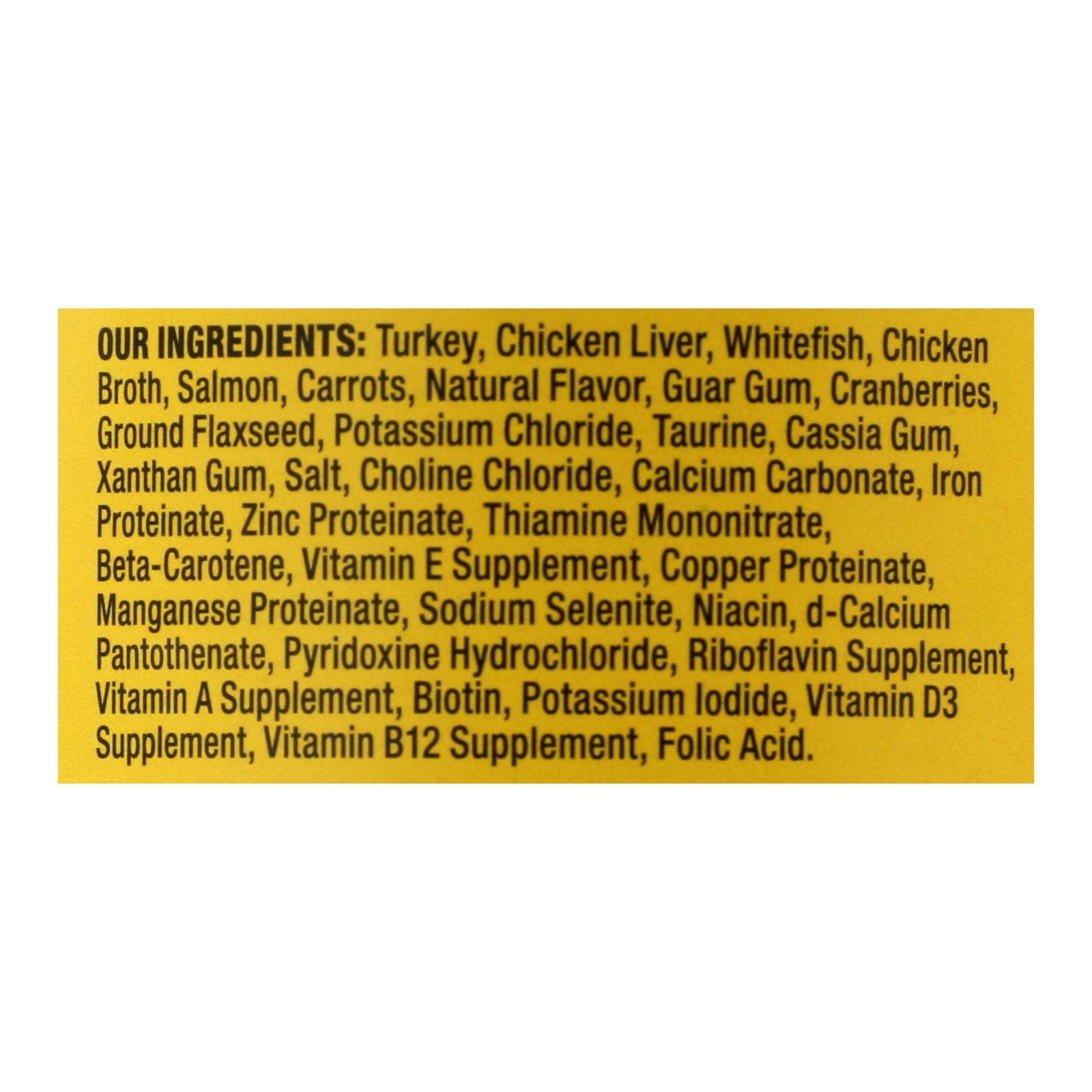 ingredients : turkey;chicken liver;whitefish;chicken broth;salmon;carrots;natural flavor;guar gum;cranberries;ground flaxseed;potassium chloride;taurine;cassia gum;xanthan gum;salt;choline chloride;calcium carbonate;iron proteinate;zinc proteinate;thiamine mononitrate;beta-carotene;vitamin e supplement;copper proteinate;manganese proteinate;sodium selenite;niacin;d-calcium pantothenate;pyridoxine hydrochloride;riboflavin supplement;vitamin a supplement;biotin;potassium iodide;vitamin d3 supplement;vitamin b12