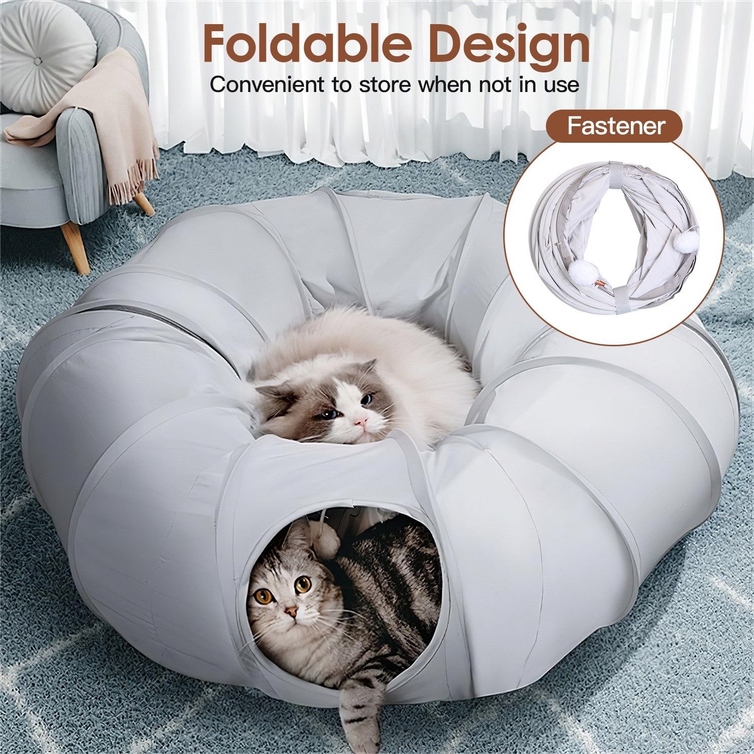 *2-IN-1 Cat Tunnel*:Consist of 2 semicircle cat tunnels and 1 round mat,this cat tunnel provides a funny playground for your furry friends to run,chase,hide-and-seek,meet the natural playing instinct. Soft,comfortable mat attract your cat to spend the whole day to lie and rest.