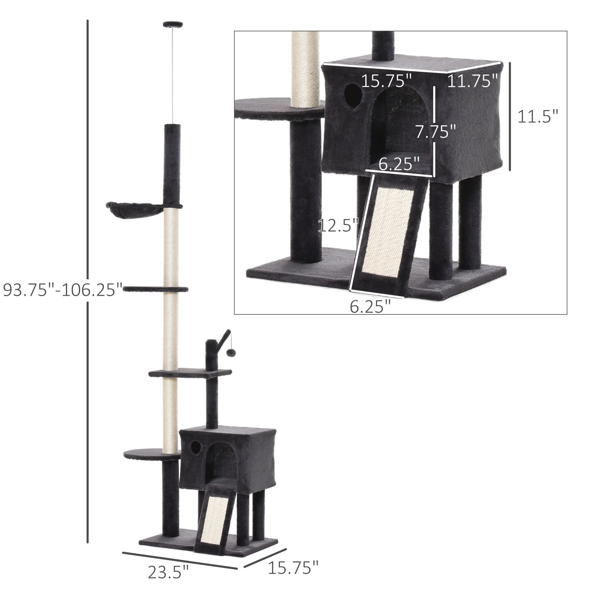 - - The floor-to-ceiling cat tree ranges in height from 93.75"-106.25"