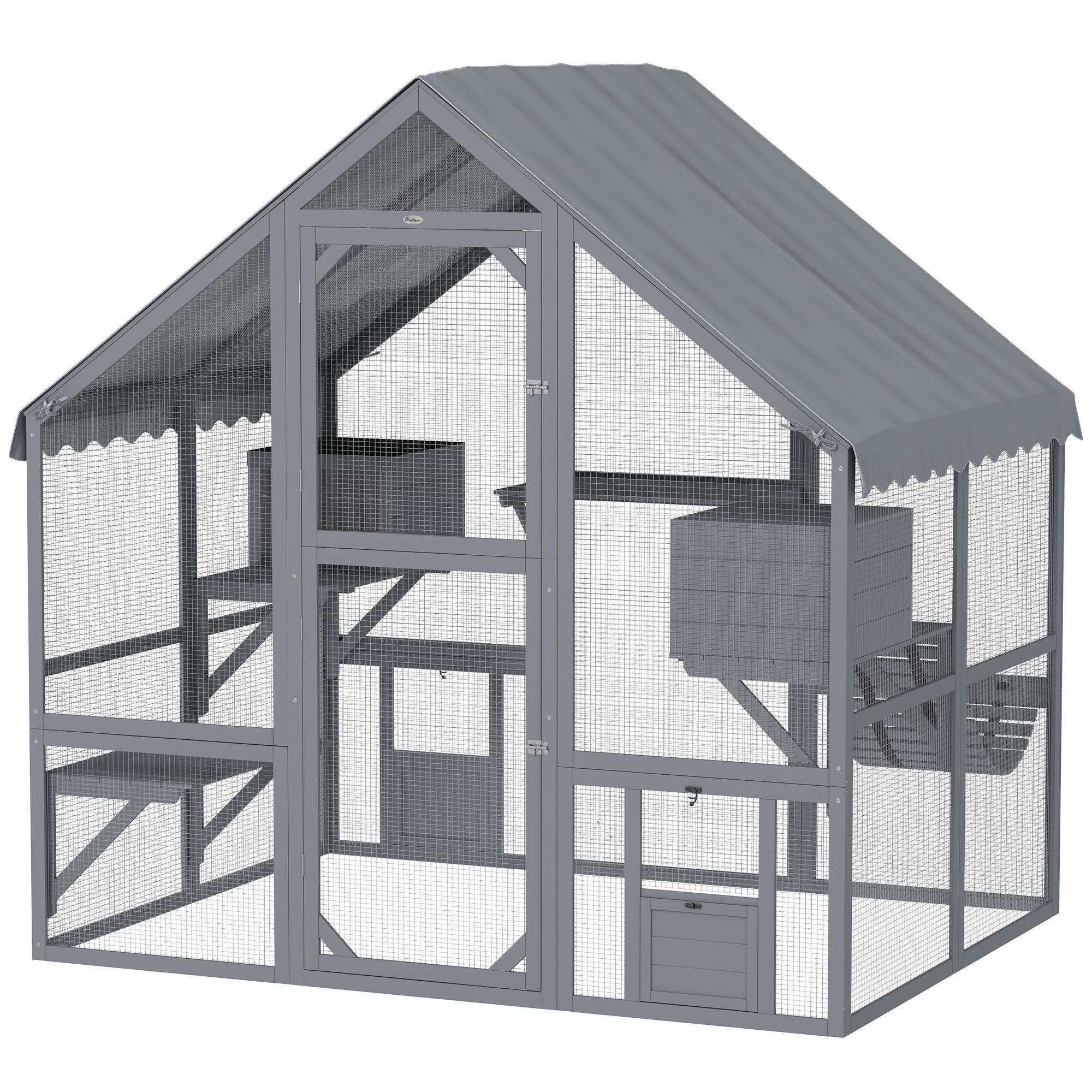 Transform your feline's outdoor adventures with this PawHut catio! This spacious cat enclosure features two cozy condos with curtains and four playful platforms, making it an excellent place for 2 to 4 cats. Crafted from fir wood and topped with a waterproof, anti-UV cover, it's a wonderful outdoor catio for your cat to enjoy fresh air while lounging in luxury and safety.