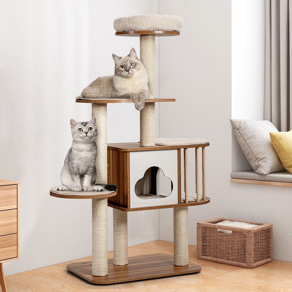 2.Exceptional Quality Materials: Comes with pet-friendly thickened soft cushions, this cat tree will deliver paws-approved warmth and ultimate comfort for your lovely kitten. Incorporated scratching posts are securely wrapped with natural sisal ropes which can not only allow your kitten to scratch repeatedly but also protect your delicate furniture from being clawed.
