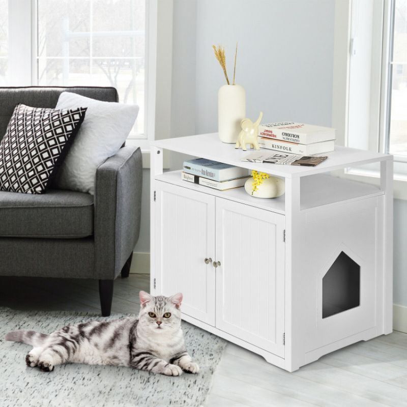 5.Practical and Large Space: Designed with a large top and an additional open shelf, this high-quality litter box cover provides spacious storage space for you. Hence, you can put different items easily, such as cat food, cat toys, and other pet supplies.